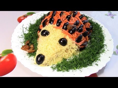 Салат хорош и для взрослых и для детей. Только в последнем случае, надо использовать отварную морковь вместо острой. Подача в форме ежа понравится всем без исключения и не надо бояться, что это будет сложно. Вовсе нет. Попробуйте повторить за мной пошаговый процесс, а результат вам обязательно понравится.